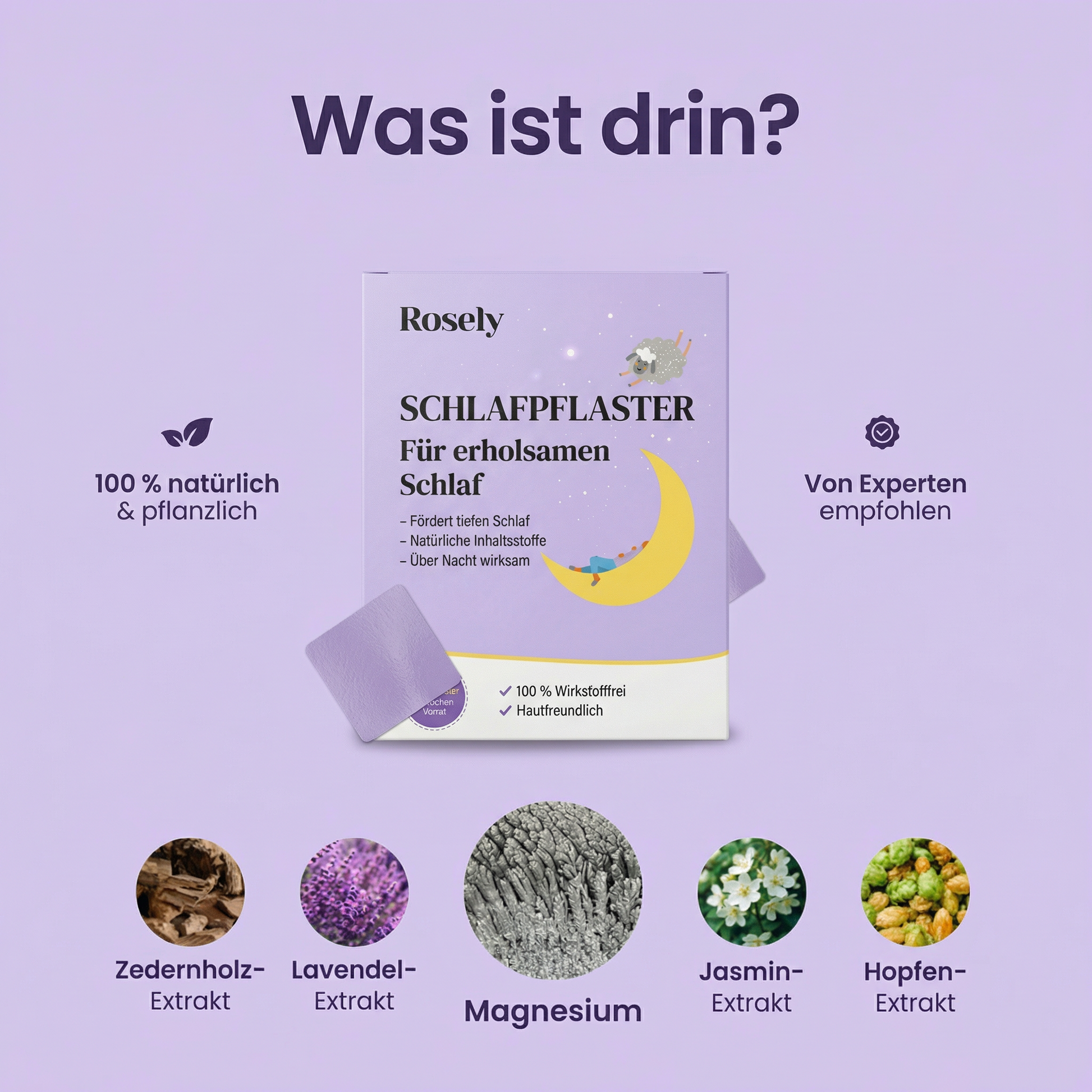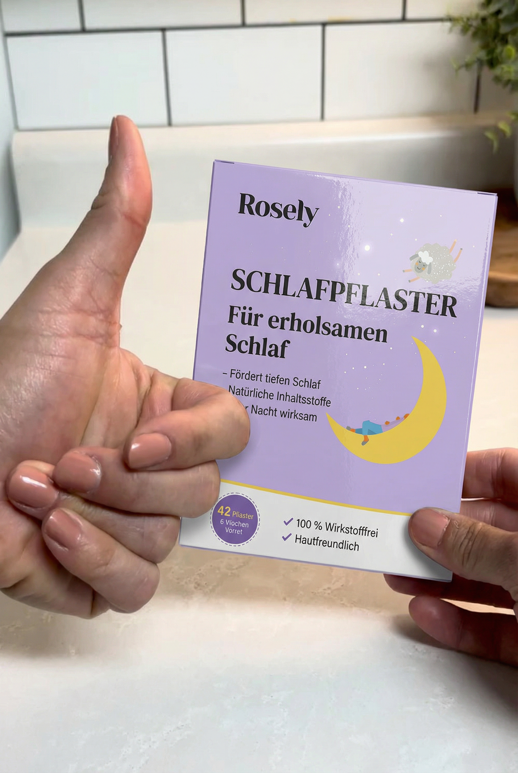 Die Rosely Pflaster wurden entwickelt, um den Schlaf auf natürliche Weise zu verbessern. Wenn Sie regelmäßig Medikamente wie Benadryl oder hohe Dosen Melatonin einnehmen, konsultieren Sie bitte Ihren Arzt, bevor Sie Änderungen vornehmen.