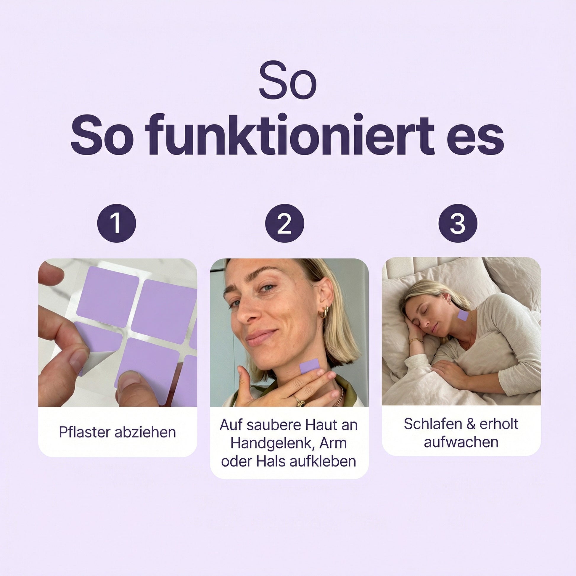 Alles, was Sie tun müssen: Schutzfolie abziehen und das Pflaster auf eine haarfreie Stelle Ihrer Haut kleben.