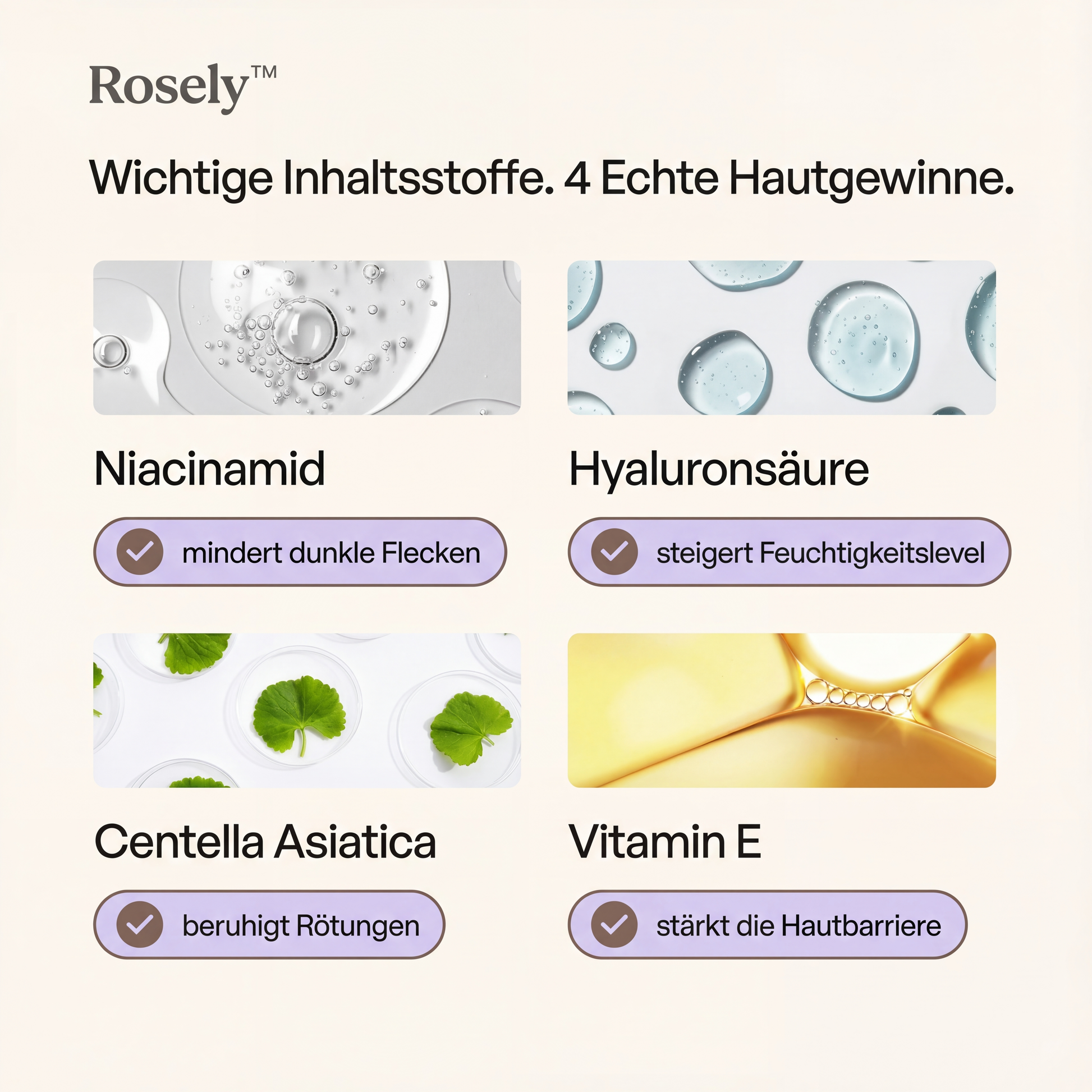 - Niacinamid: Gleicht den Hautton aus und mildert dunkle Flecken für einen ebenmäßigen Teint.